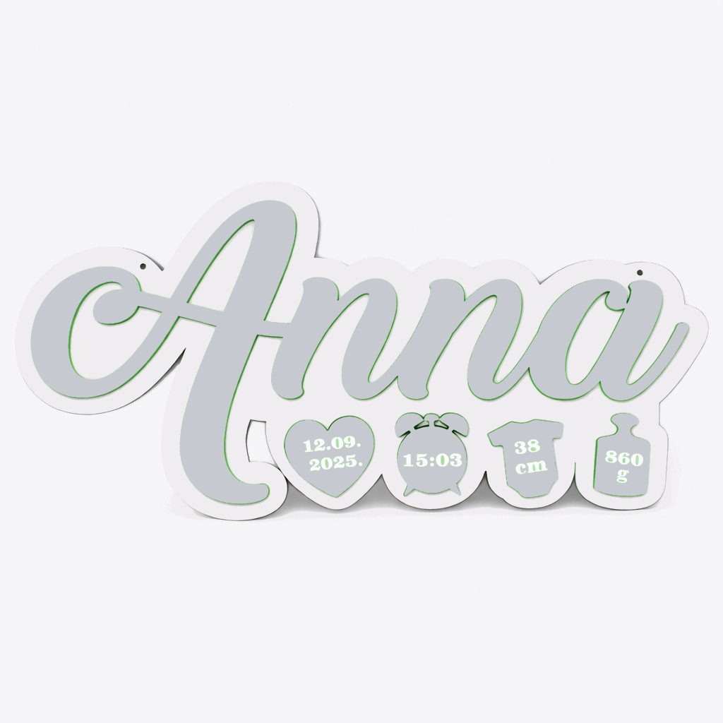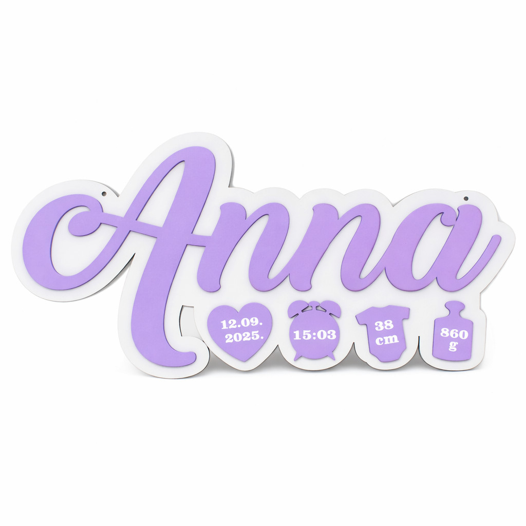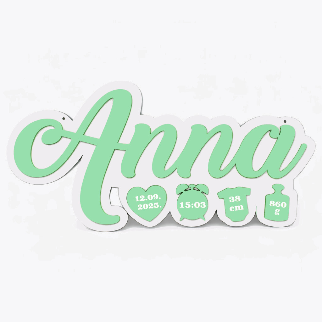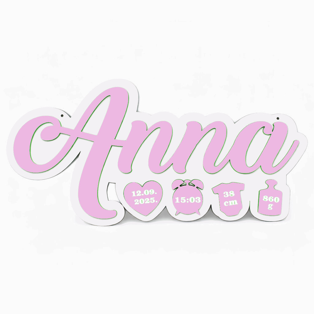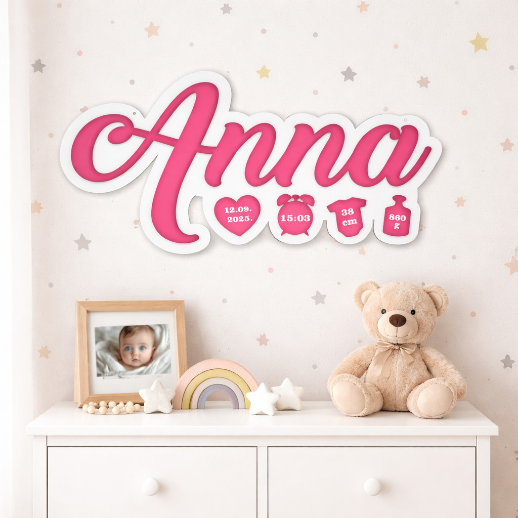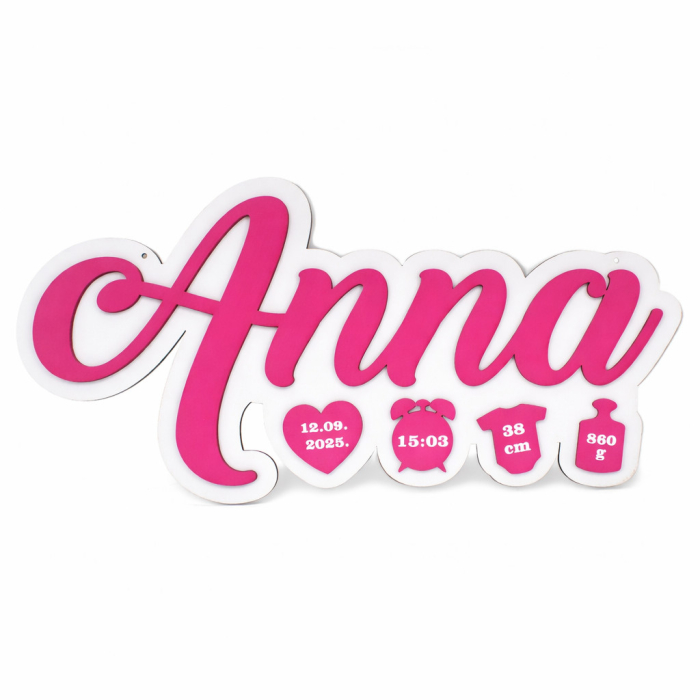 Placa include numele copilului si simboluri dragute cu informatii importante: data nasterii, ora, lungimea si greutatea la nastere. Designul este jucaus, dar elegant, usor de integrat in orice stil de amenajare – de la clasic la scandinav sau minimalist.