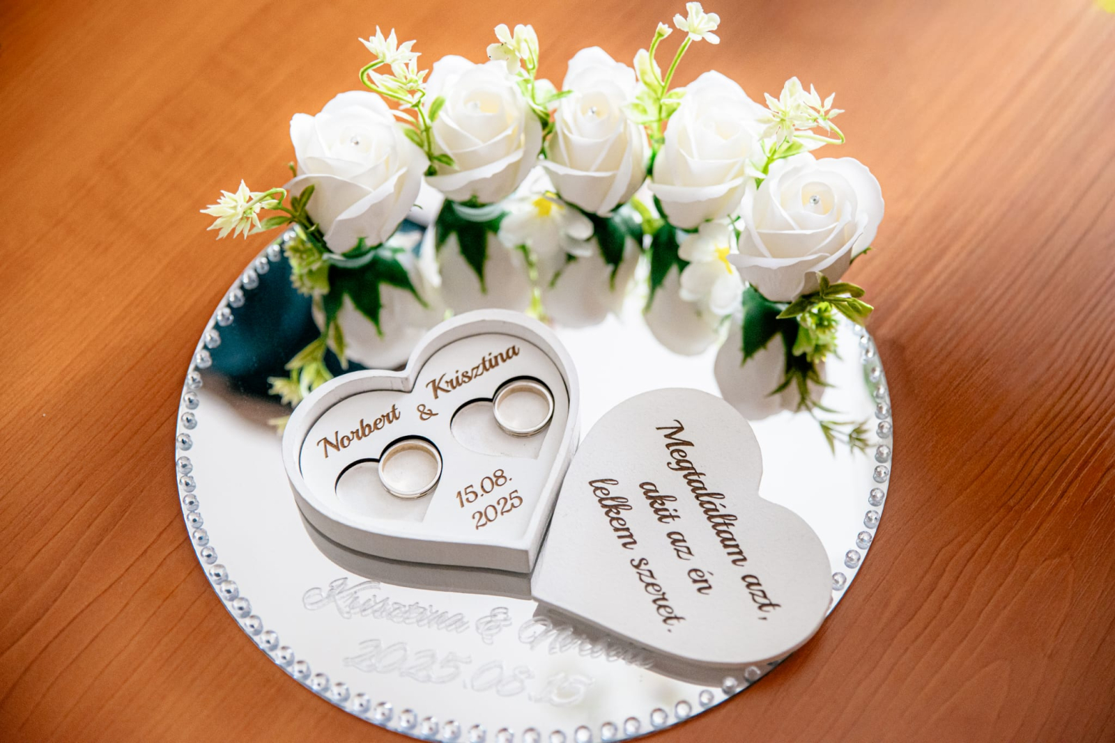 Egyszerűen csodálatos minden! A személyre szabott gyűrűtartó és a két névre gravírozott válfa tökéletesen illenek az esküvőnk stílusához. A kivitelezés precíz, az anyagminőség kifogástalan, a részletek pedig gyönyörűek. Látszik, hogy minden darab szeretettel készült. A kommunikáció gyors és kedves volt, a csomagolás igényes, a szállítás villámgyors. Szívből ajánlom mindenkinek, aki különleges, egyedi esküvői kiegészítőket keres!