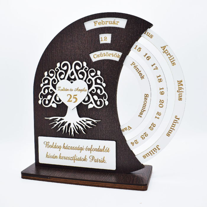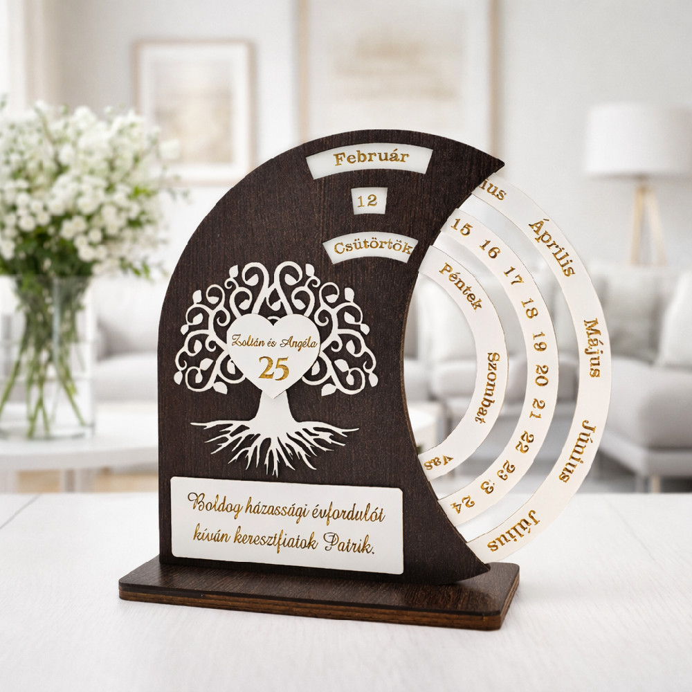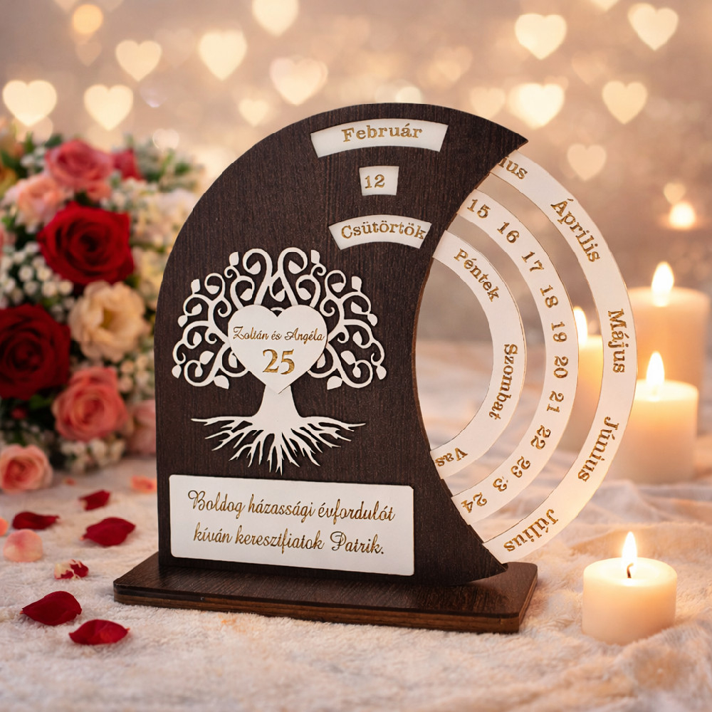 Calendarul este format din discuri rotative care permit afisarea lunii, zilei si zilei saptamanii, astfel incat data aniversarii poate fi evidentiata intr-un mod decorativ si original. Designul este completat de arborele vietii, simbol al iubirii, stabilitatii si legaturii puternice dintre doua persoane.