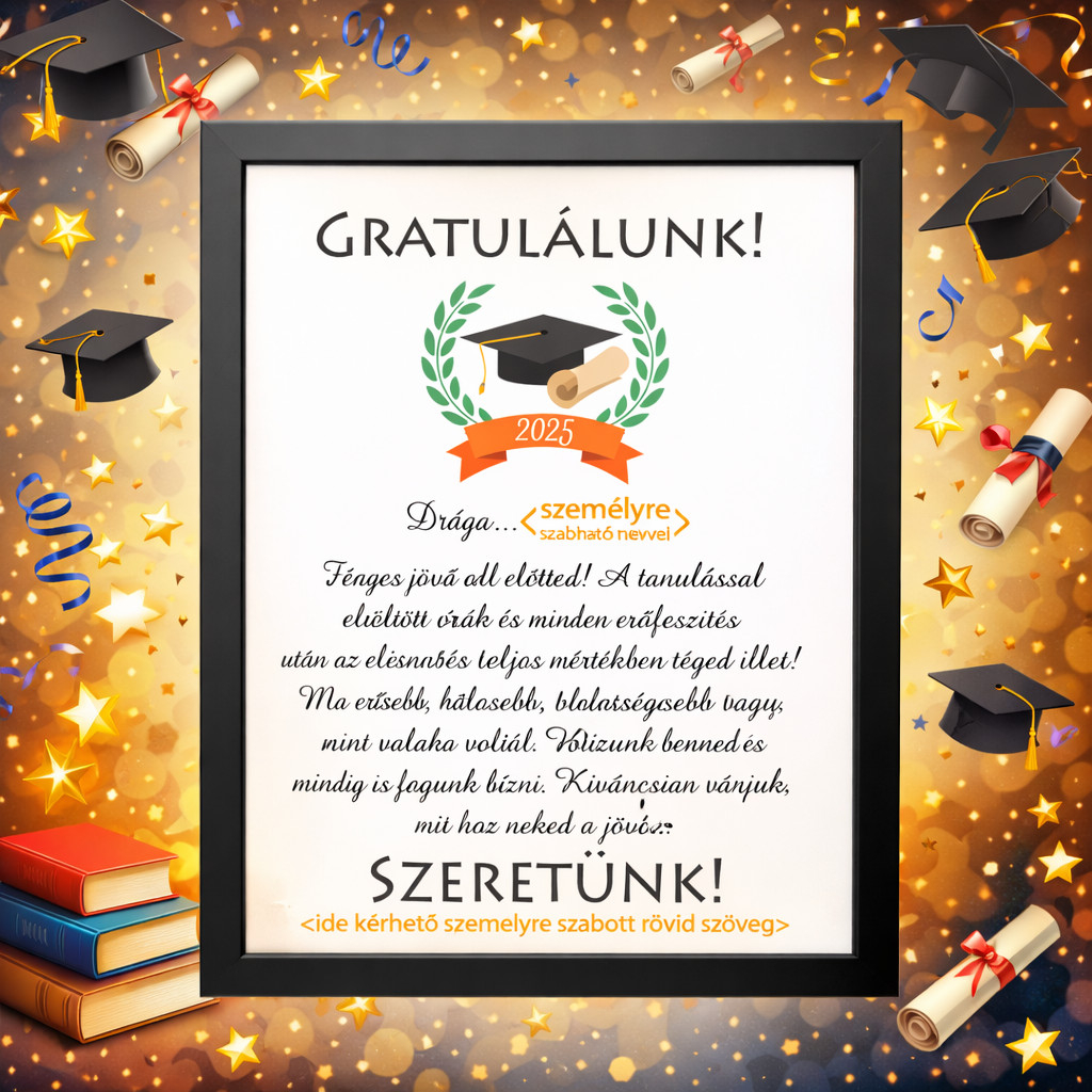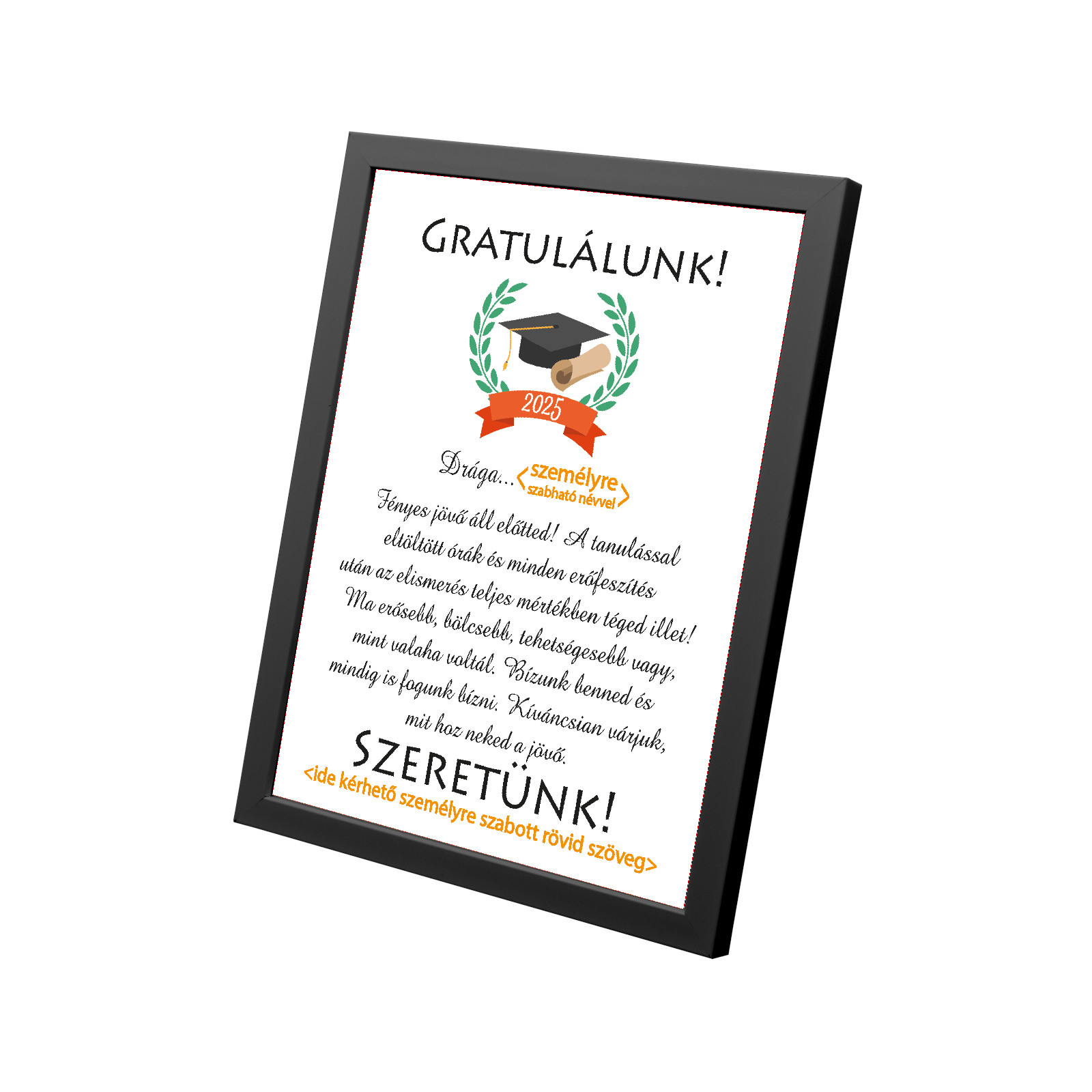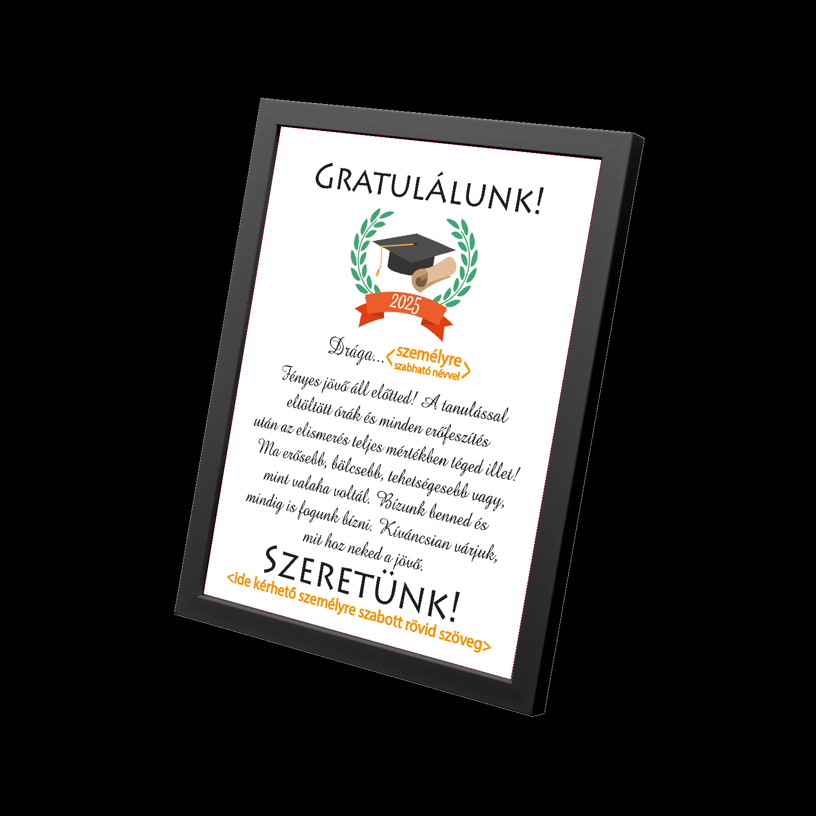 Designul elegant include mesajul „Gratulalunk!” si simboluri specifice absolvirii (toc, diploma, coronita), fiind ideal pentru absolvire liceu, facultate sau alte etape educationale. Tabloul poate fi personalizat cu nume si mesaj scurt, transformandu-l intr-un cadou cu adevarat special si emotional.